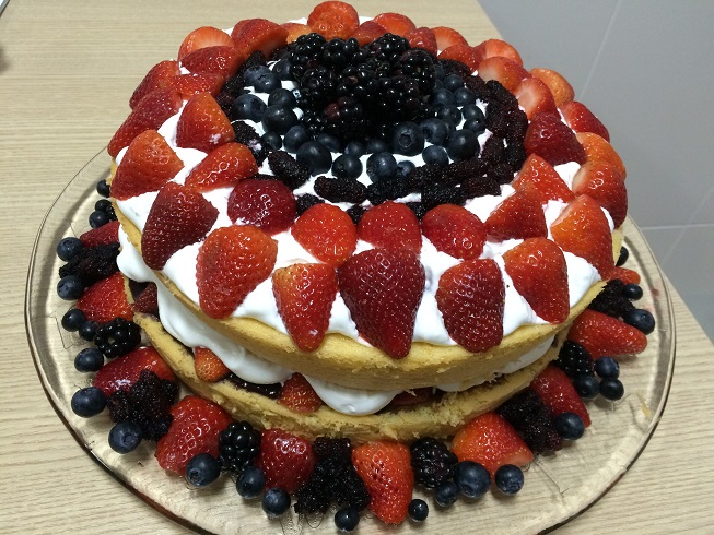 Coloque o 1º bolo no prato que for servir. Cubra com uma camada generosa de geléia, depois com frutos vermelhos deixando aparecer bem nas bordas e por último a metade do chantilly. Coloque o 2º bolo, barre com um pouco de geléia, depois chantilly e por último enfeite com frutos vermelhos.