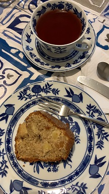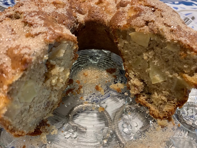 Bater no liquidificador os ovos, o óleo e as cascas da maçã. Colocar essa mistura na tigela com os ingredientes secos. Misturar muito bem com uma espátula e, por último, colocar os cubinhos de maçã nessa massa. Misturar e despejar na assadeira. Levar para assar por cerca de 40 a 50 minutos em forno médio (se começar a dourar ou cheirar . Fazer o teste do palito para ver se está pronto). Depois de pronto polvilhar açúcar e canela.
