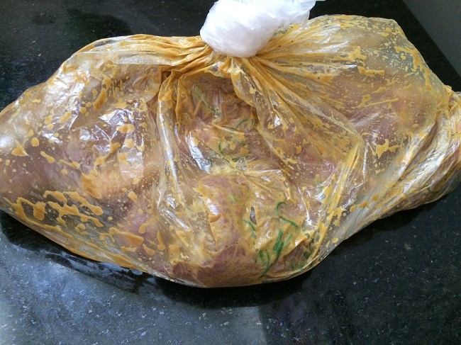 Na véspera ou algumas horas antes de cozinhar coloque no saco e cubra com o molho inglês, mostarda, azeite e alecrim. Feche o saco e esfregue os temperos na carne por alguns minutos. Deixe marinando na geladeira.