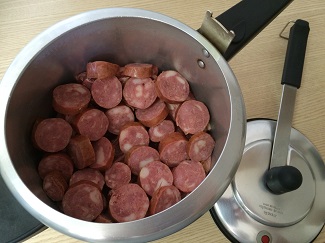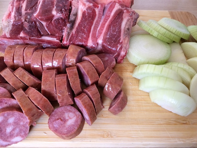 Corte as cebolas em rodelas grossas e forre o fundo da panela de pressão. Coloque as costelas em pedaços sobre a cebola e cubra com a linguiça cortadinha.