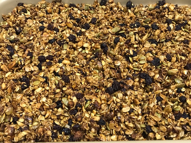 Espalha num tabuleiro, de preferência antiaderente. Assa por uns 20min, virando na metade. Qdo tirar do forno mistura as passas e cranberry, ainda quente.