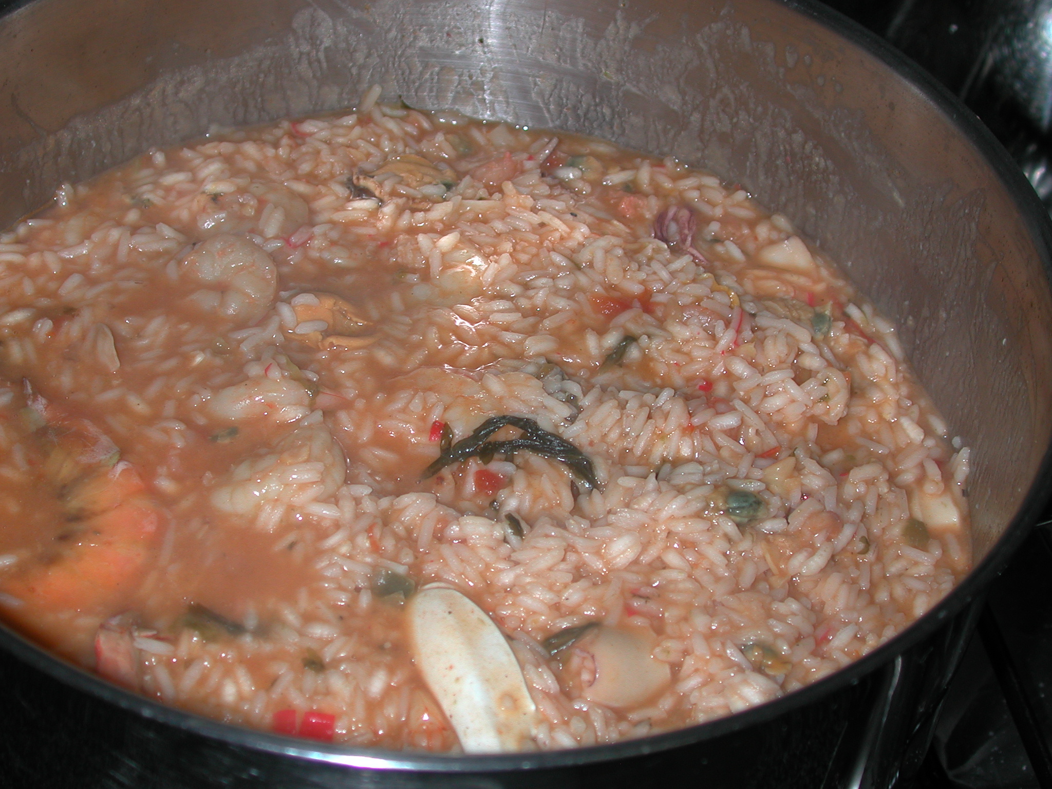 Quando o arroz já estiver quase cozido junte o resto dos mariscos que cozinham rapidamente - camarão, mexilhão, etc. Se precisar coloque mais água quente.