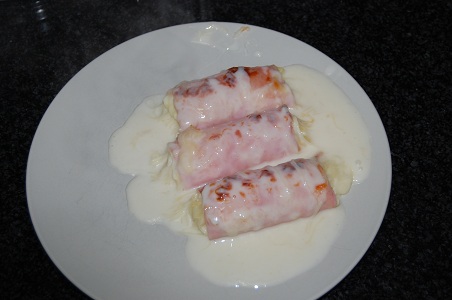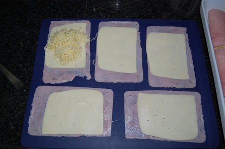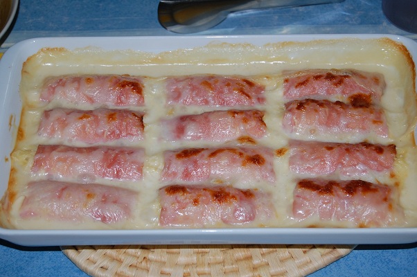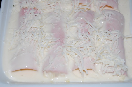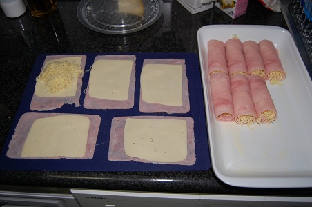 Abra uma fatia de fiambre (presunto) e coloque uma de queijo por cima. Coloque um pouco de massa, enrole e coloque numa travessa de forno untada com manteiga. Repita a operação até acabar os ingredientes. Cubra com molho branco, polvilhe com mozzarela e leve ao forno médio pré-aquecido para dourar o queijo. Sirva em seguida.