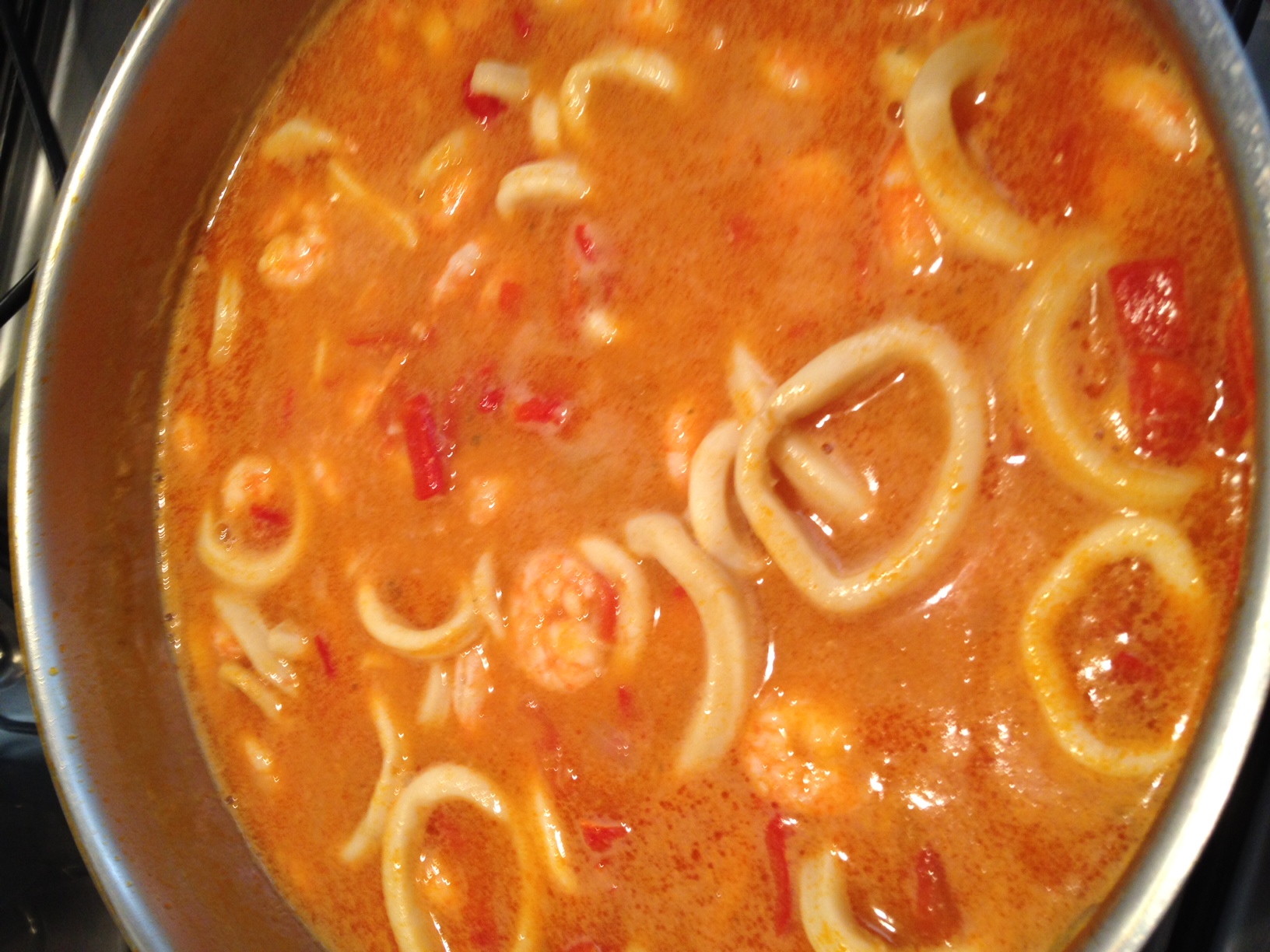Faça um refogado com a cebola, pimentão, alho e azeite. Qdo estiver começando a fritar junte o tomate. Coloque a lula, mexa bem, tempere com meia colher de sobremesa de sal e um pouco de pimenta, junte o vinho, o molho de tomate e o caldo de peixe ou água. Feche a panela e deixe cozinhar por uns 30min. Depois que estiver cozido junte o camarão, deixe uns 5 a 10 min e desligue o fogo.
