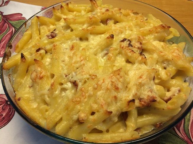 Misture 2/3 dos queijos e o bacon no molho branco. Junte o macarrão neste molho, unte um pirex com manteiga e coloque o macarrão. Por cima jogue o resto dos queijos. Ligue o forno a 180º e deixe o macarrão cozinhar até dourar (uns 30min).