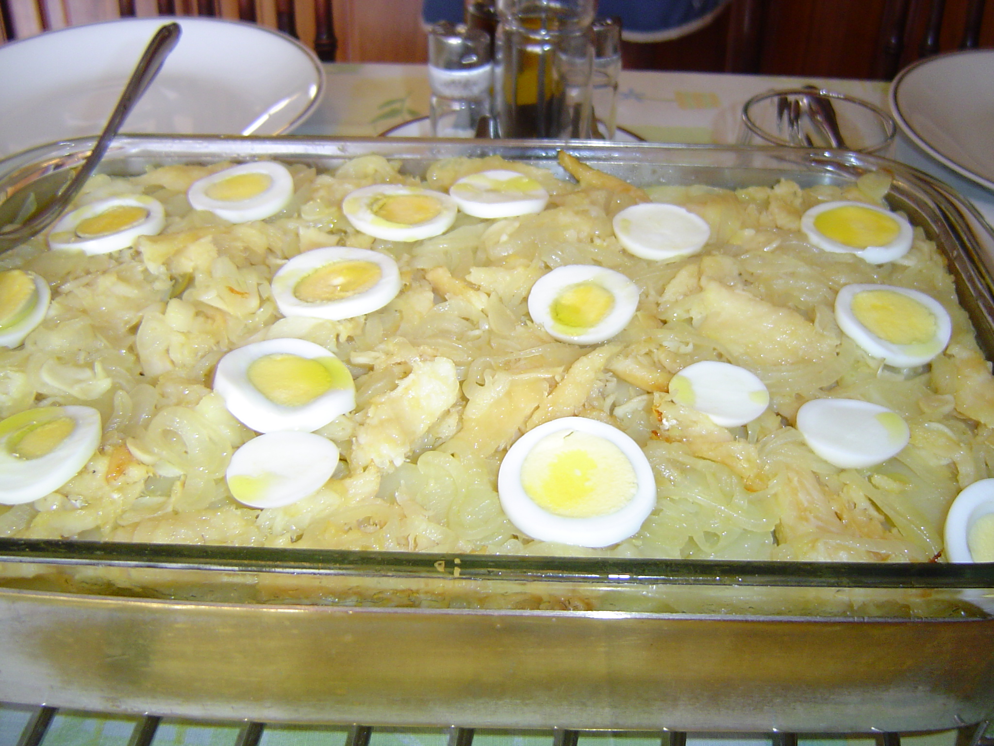 Montagem - batatas em baixo, bacalhau no meio, em cima - cebolas com alho, salsa, azeitonas e ovos cozidos. Por último uma quantidade generosa de azeite.