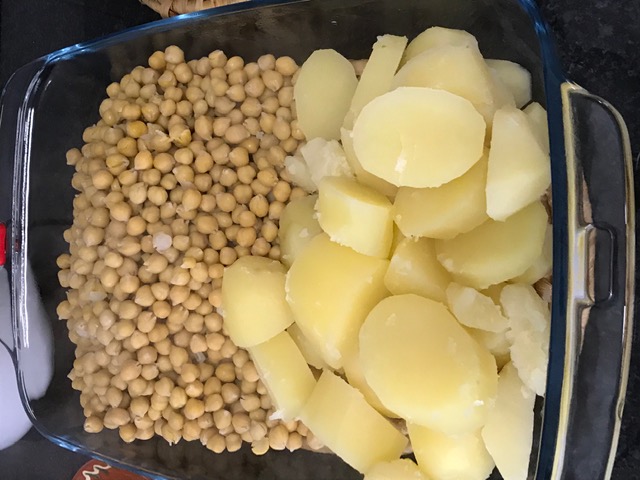 Cozinha a batata e grão de bico (separadamente) com água e sal.