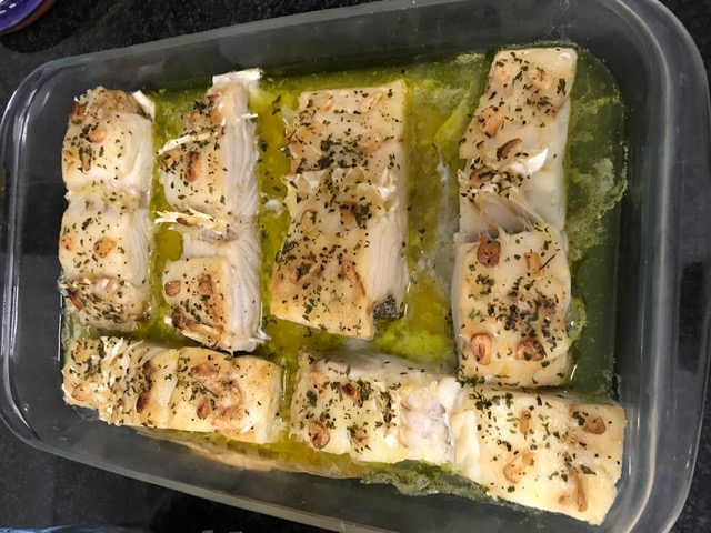 Coloca as lascas de alho, pimenta moída, azeite e salsa sobre o bacalhau e leva a forno médio por 40min.