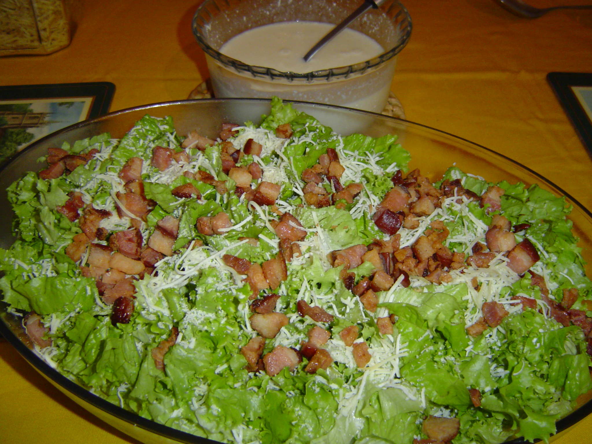 Doure o bacon numa frigideira, sem colocar gordura, até ficar dourado. Escorra a gordura e espalhe sobre o alface. Jogue por cima parte do queijo.