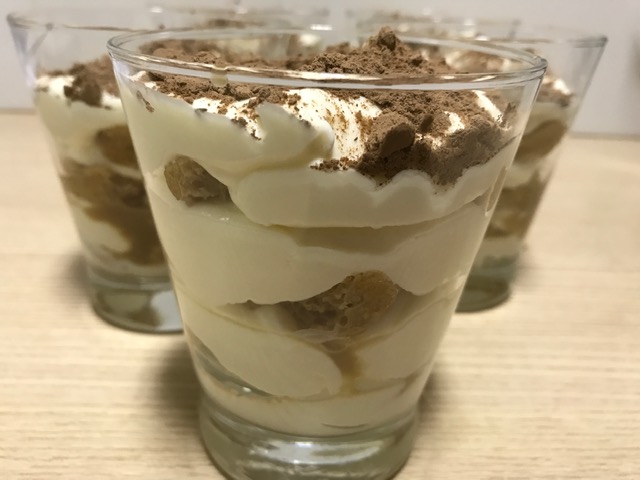 Misture o café com o licor num recipiente tipo prato fundo, mergulhe os biscoitos na mistura (só de um lado para não ensopar demais), use-os para forrar o fundo do recipiente de vidro, cubra esta 1ª camada de biscoito com metade do creme e repita terminando com o creme. Por último polvilhe com o chocolate em pó usando uma peneira pequena.