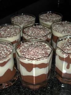 Com colheres de sopa distribua os cremes alternadamente pelas taças.Polvilhe-as com chocolate em pó ou raspas de chocolate e sirva-as bem frescas.